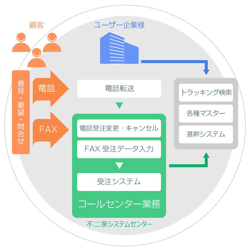 電話受注等のインバウンド業務や商品案内/アンケート、不備データ確認等のアウトバウンド業務をお客様に代わり低コストでかつ迅速に対応いたします。